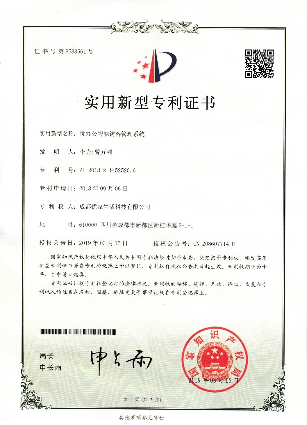 公司产品“优办公智能访客管理系统”获得实用新型专利