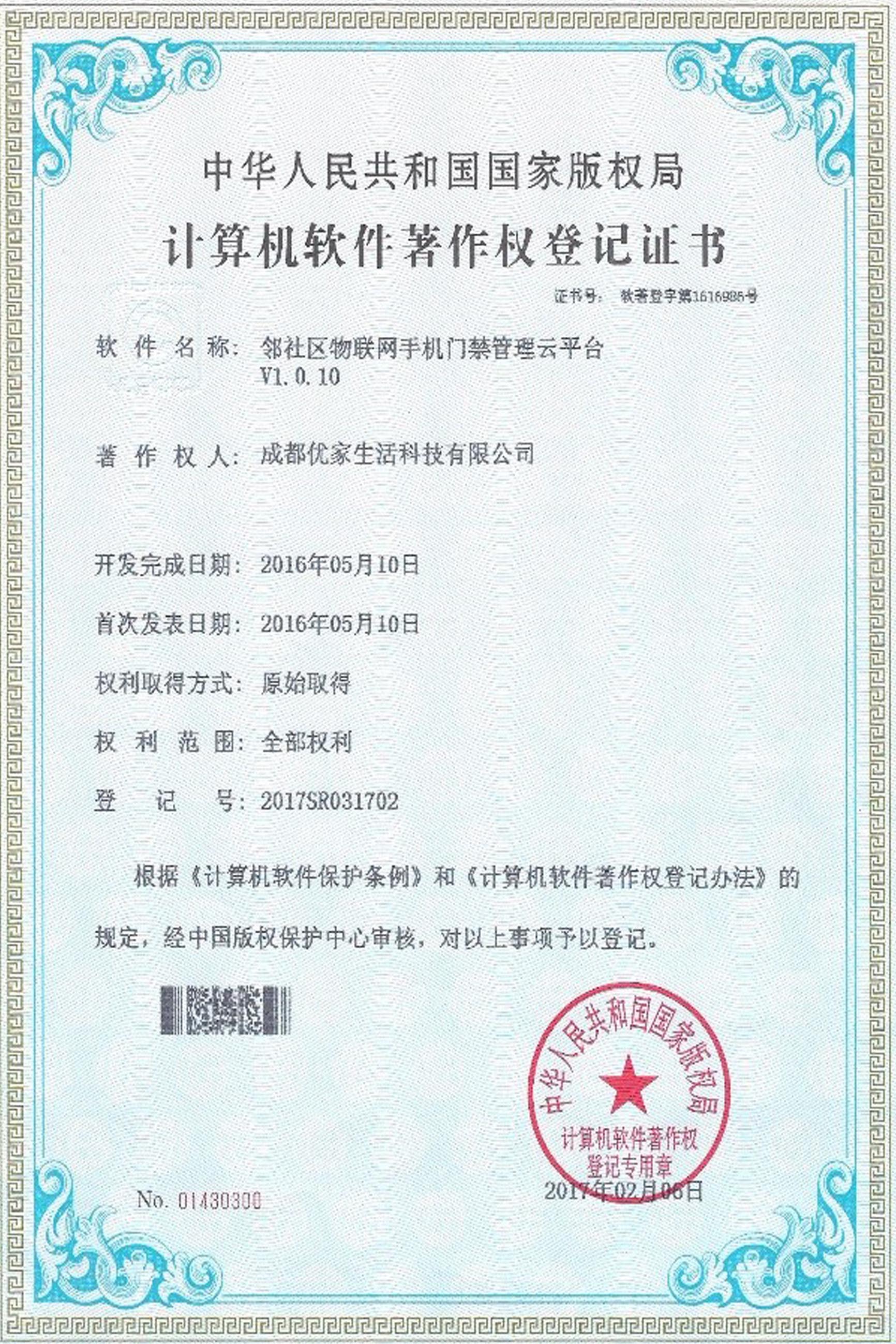 邻社区物联网手机门禁系统新获得1项软件著作权