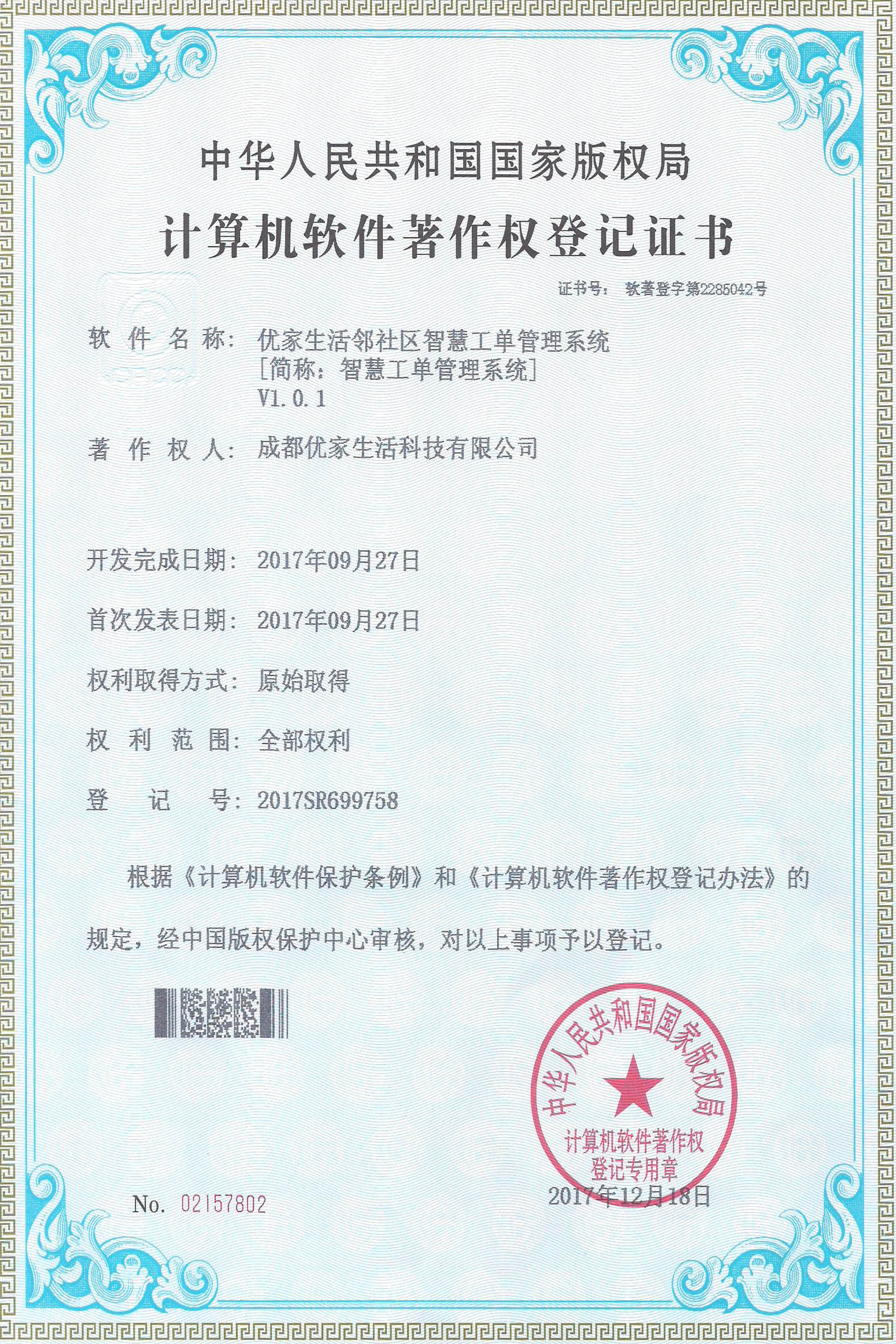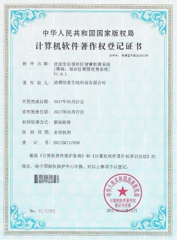 公司获得软件著作权:优家生活智能物业及O2O平台管理软件V1.0。