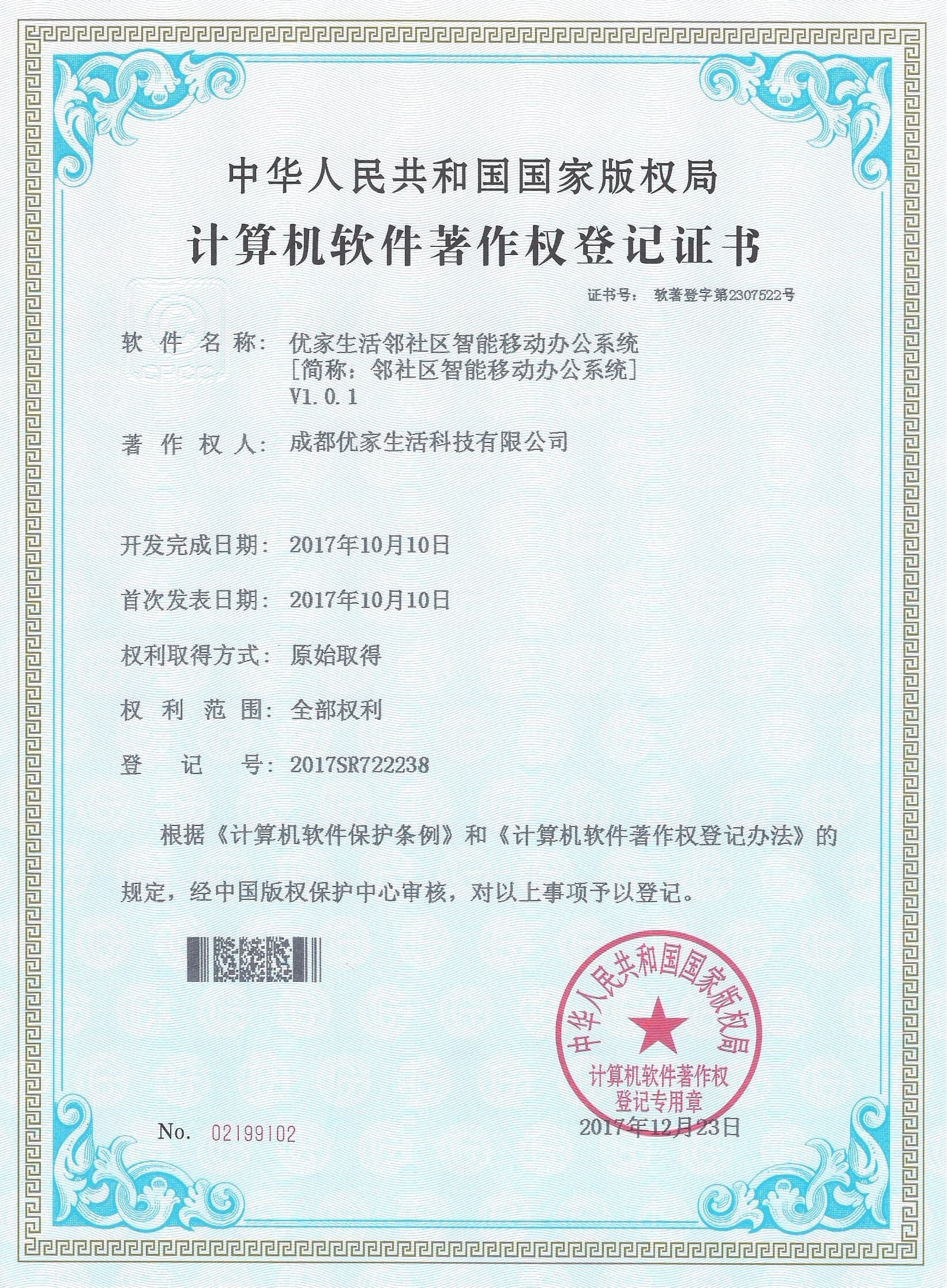 公司产品“优家生活邻社区智能移动办公系统”获得软件著作权