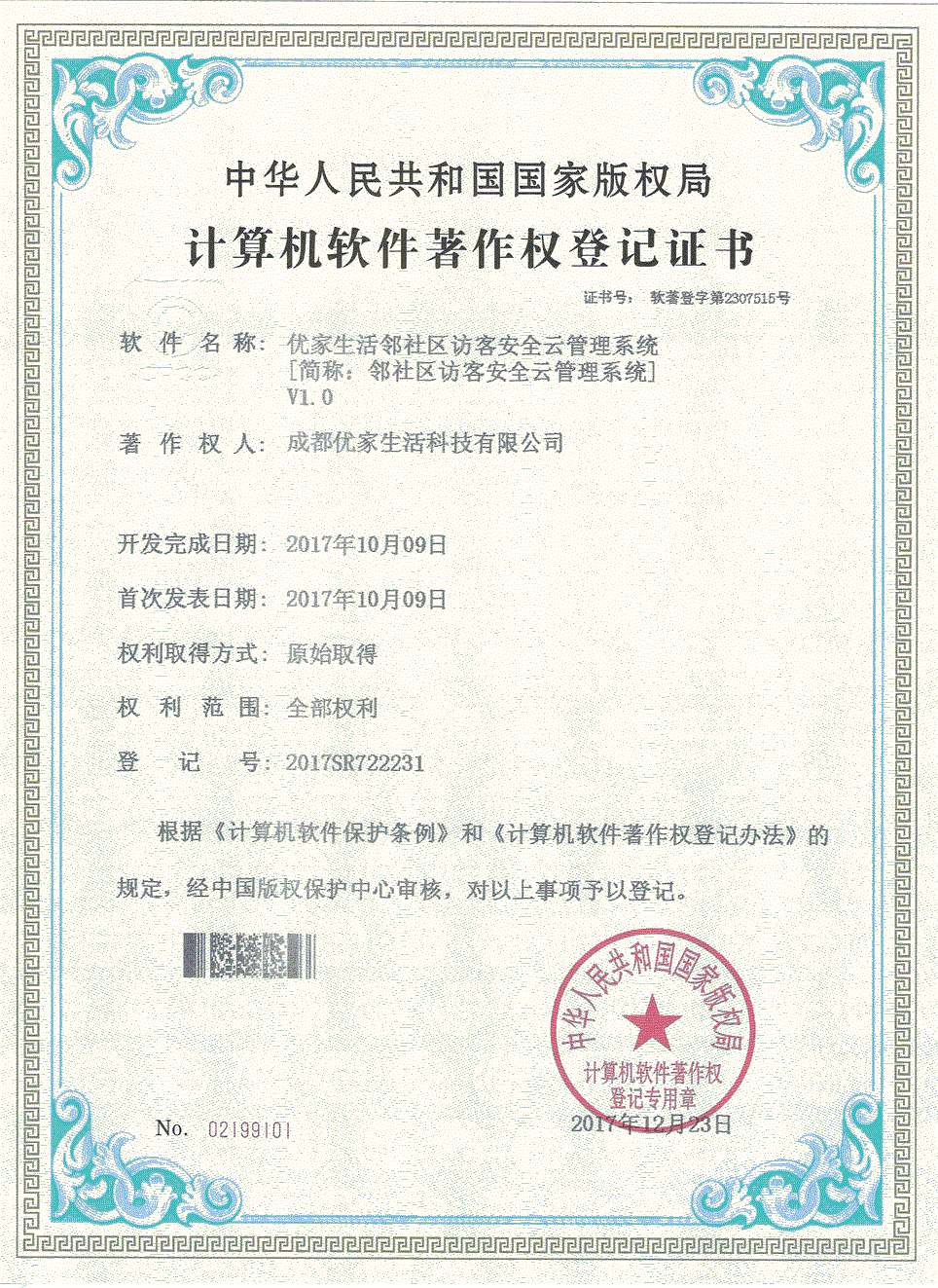 公司产品“优家生活邻社区访客安全云管理系统”获得软件著作权
