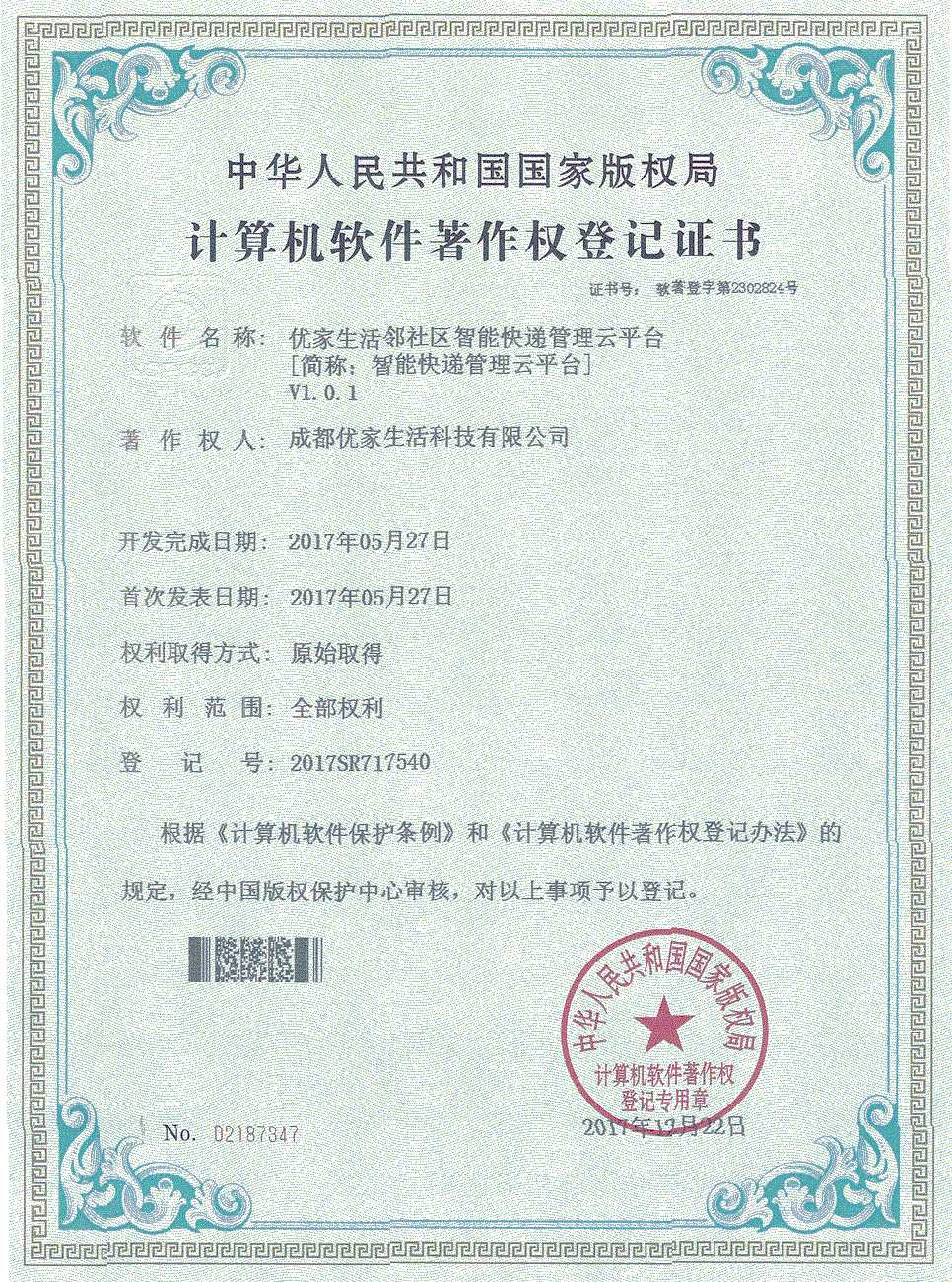 公司产品“优家生活邻社区智能快递管理云平台”获得软件著作权
