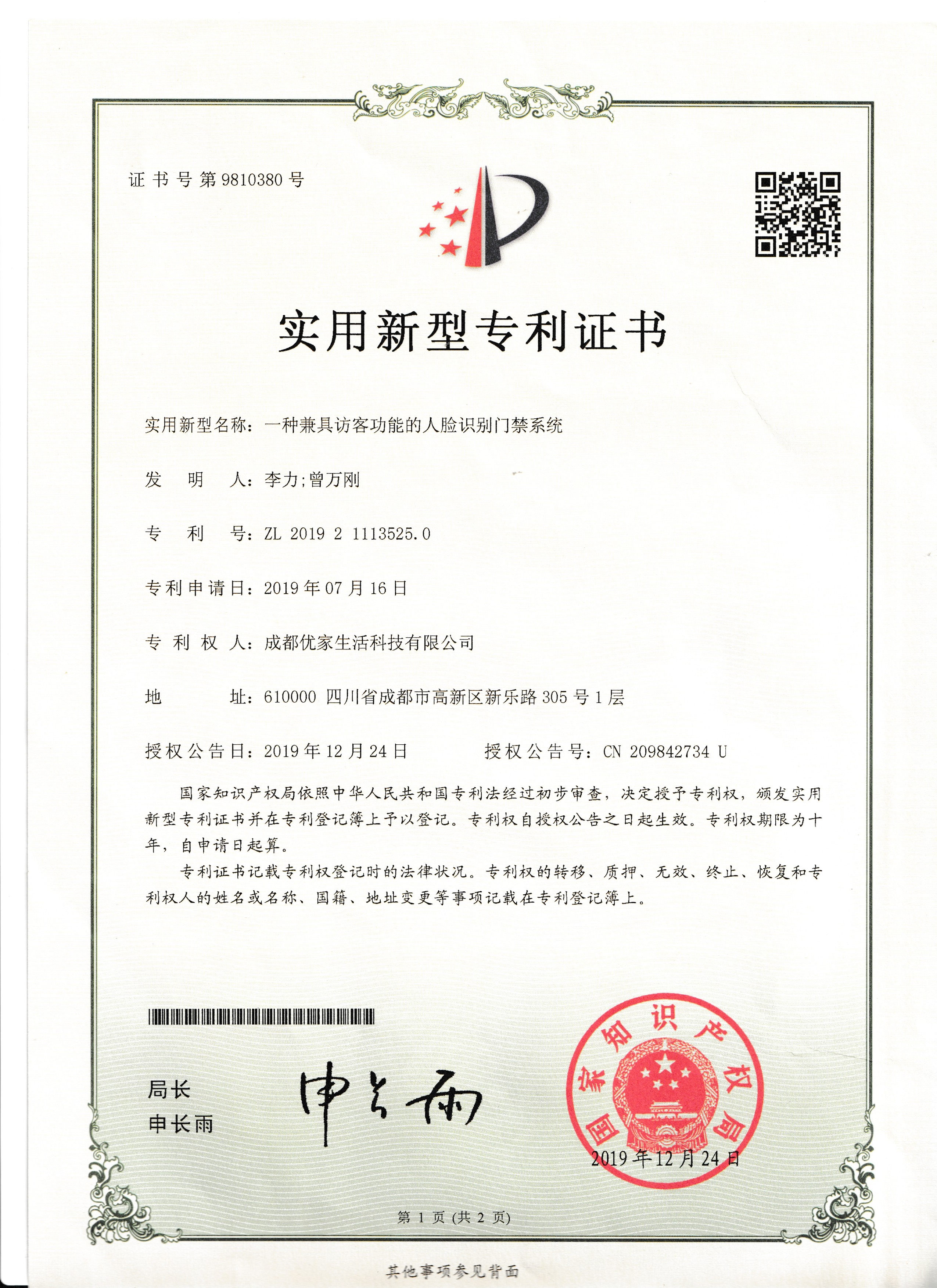 公司的“一种兼具访客功能的人脸识别门禁系统”获得实用新型专利